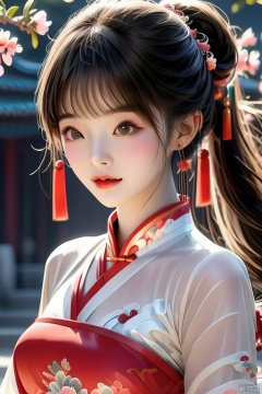 (Top quality, best quality, art, beauty and aesthetics: 1.2) A beautiful girl, dressed in Chinese clothing, slim face, closed mouth, black eyes, black and white gradient long hair, peach blossom, ponytail, tassels, white dress, sheer, looking at the camera, calm, Chinese New Year, ultra fine, 2K, ultra clear,