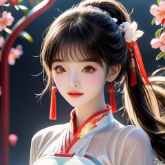 (Top quality, best quality, art, beauty and aesthetics: 1.2) A beautiful girl, dressed in Chinese clothing, slim face, closed mouth, black eyes, black and white gradient long hair, peach blossom, ponytail, tassels, white dress, sheer, looking at the camera, calm, Chinese New Year, ultra fine, 2K, ultra clear, hair