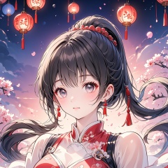 (Top quality, best quality, art, beauty and aesthetics: 1.2) A beautiful girl, dressed in Chinese clothing, slim face, closed mouth, black eyes, black and white gradient long hair, peach blossom, ponytail, tassels, red dress, sheer, looking at the camera, calm, Chinese New Year, ultra fine, 2K, ultra clear, hair,Facial shape,Exquisite appearance,Bright eyes, face,eyes