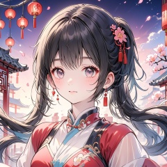 (Top quality, best quality, art, beauty and aesthetics: 1.2) A beautiful girl, dressed in Chinese clothing, slim face, closed mouth, black eyes, black and white gradient long hair, peach blossom, ponytail, tassels, red dress, sheer, looking at the camera, calm, Chinese New Year, ultra fine, 2K, ultra clear, hair,Facial shape,Exquisite appearance,Bright eyes, face,eyes