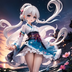 2D animation, anime style, girl standing in the water, dress, tulle hanbok, white hair, dynamic posture, pale skin, charming beauty, gorgeous eyes, elegant face, details, peach blossom forest, ultra lifelike, high-definition, 8k, 3d, rubber texture, digital illustration, niji 5, aestheticism, art, photography style, night, moon, starlight,