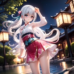 2D animation, anime style, girl standing in the water, pink dress, tulle hanfu, white hair, dynamic posture, pale skin, charming beauty, gorgeous eyes, elegant face, details, peach blossom forest, super lifelike, high-definition, 8k, 3d, rubber texture, digital illustration, niji 5, aestheticism, art, photography style, night, moon, starlight,