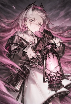 best quality, masterpiece, 1girl, solo, irene \(arknights\), gloves, scar across eye, black gloves, long hair, lantern, holding, scar, weapon, grey hair, sword, scar on face, grey eyes, parted lips, looking at viewer, holding lantern, head wings, long sleeves, jacket, black jacket, earrings, pink hair, jewelry, skirt<lora:rsefXLlokr4f-000143:0.95>