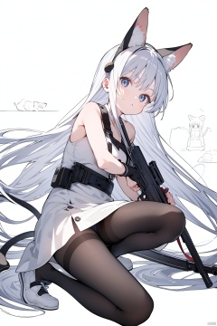 sniper rifle, 1girl, bolt action, solo, holding, very long hair, colored eyelashes, rifle, gun, one knee, white pantyhose, long hair, holding gun, holding weapon, dress, animal ears, blue eyes, pantyhose, underwear, weapon, animal ear fluff, white dress, white panties, panties, torn clothes, bandages, white hair, white footwear, sleeveless dress, cat ears, thigh holster, panties under pantyhose, holster, sleeveless, bandaged arm, white background, cat tail, torn pantyhose, shoes, bangs, pantyshot, cuts, headphones, injury, white theme, knife, cat girl, signature, scope, tail, bare shoulders, handgun, artist name,