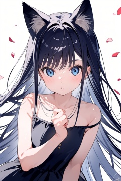 1girl, solo, animal ears, blue eyes, long hair, blurry foreground, parted lips, depth of field, bare shoulders, white background, strap slip, animal ear fluff, colored eyelashes, blurry, bangs, cat ears, sleeveless dress, signature, looking at viewer, sleeveless, dress, upper body, simple background, petals, black dress, collarbone,