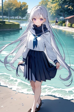 1girl, solo, flower, skirt, school_uniform, holding, long_hair, scarf, shoes, outdoors, water, pleated_skirt, sailor_collar, holding_flower, bangs, purple_eyes, looking_at_viewer, standing, long_sleeves, shirt, serafuku, wading, blush, blue_flower, white_shirt, shoes_removed, loafers, grey_hair, barefoot, very_long_hair, black_skirt, hair_between_eyes, breasts