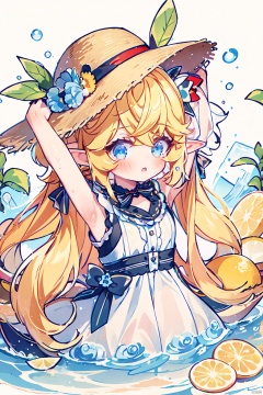 chibi,1girl, fruit, solo, dress, food, twintails, long_hair, armpits, pointy_ears, bug, white_dress, blonde_hair, butterfly, wading, blue_eyes, wet_dress, arms_up, lemon, water, flower, hat, sleeveless, wet, hair_ribbon, looking_at_viewer, sleeveless_dress, ribbon, banana, mouth_hold, lemon_slice, breasts, very_long_hair, bare_shoulders, wet_clothes, grapes, orange_\(fruit\), straw_hat, red_ribbon, elf, waterfall, red_flower, sundress, see-through, standing, bangs, bare_arms, blush, hair_between_eyes, water_drop, small_breasts, yellow_flower