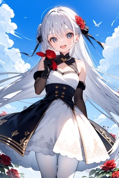 1girl, solo, flower, gloves, long_hair, smile, holding, dress, bird, very_long_hair, :d, blush, white_pantyhose, red_flower, pantyhose, looking_at_viewer, bangs, open_mouth, rose, white_dress, grey_eyes, bare_shoulders, holding_flower, animal, black_gloves, hair_between_eyes, bow, white_hair, sky, red_rose, fur_trim, depth_of_field, blurry