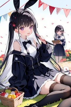 multiple_girls, 2girls, outdoors, long_hair, smile, red_eyes, butterfly, black_hair, purple_eyes, boots, day, :d, bug, long_sleeves, hair_over_one_eye, flower, sleeves_past_wrists, animal, food, closed_mouth, lace-up_boots, very_long_hair, thighhighs, white_shirt, white_hair, black_footwear, bangs, shirt, cross-laced_footwear, picnic, skirt, ahoge, sandwich, hair_ornament, holding, jacket, fruit, open_mouth, sitting, petals, red_flower, ribbon, cat, rabbit, blush, off_shoulder, looking_at_viewer, cup, hair_ribbon, sleeves_past_fingers, dress, frills, black_jacket, grass, bow