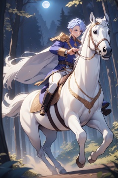 1boy,The prince is riding a white horse galloping through the forest at night,short hair,cinematic photo,4k,highly detailed,uhd image,intricate details,detailed scene background,detailed,<lora:糖果森林_XL_LoRA_v1.1:1.3>,, masterpiece,best quality,very aesthetic,absurdres,