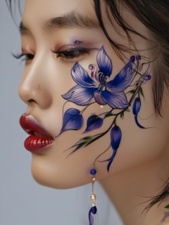 Zhuangrong,solo,tattoo,blue pattern,hand-painted,1girl,black hair,close-up,mole,lips,long hair,jewelry,open mouth,makeup,realistic,lipstick,earrings,<lora:xlgfzr:1>,