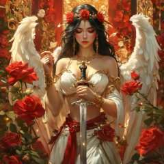 <lora:xltk:0.6>,white wings, 1girl, flower, wings, rose, jewelry, solo, red flower, long hair, weapon, sword, closed eyes, earrings, breasts, red rose, black hair, holding, armlet, red lips, bracelet, petals, angel wings, white flower, holding weapon, feathered wings, angel, artist name, blood, holding sword, bare shoulders, blurry, necklace, chain, depth of field, lips, white rose, gold chain