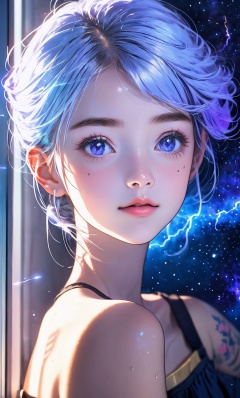 Masterpiece, best quality, cell shadow illustrations. The petite schoolgirl, with her long, glowing white hair floating in weightlessness, looked out her classroom window at a vibrant, blue and violet nebula, shoulders back. Perfect Face... Lightning blue swimming tattoo. Shining Golden Eyes. Bottom of perspective Z, realistic style perspective