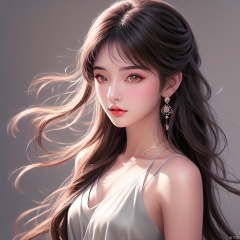 (Top quality, best quality, art, beauty and aesthetics: 1.2)1girl, solo, long hair, looking at viewer, brown hair, bare shoulders, brown eyes, upper body, grey background, camisole, realistic,A closed mouth