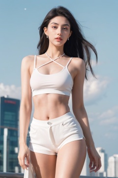 Masterpiece,highest quality,realistic,very fine and fine details,high resolution,8K,taken by Canon EOS,SIGMA Art Lens 35mm F1.4,ISO 200 Shutter Speed 2000,Vivid picture, 25yo hubgmodel,hubggirl,finely_detailed_skin,highly detailed clothing,depth of field,detailed background,random_mouth,horny look,(hair:1.2),sexy poses,ahg, seductive eyes,sexy gaze,horny,natural posture,long_legs,jewelry,lips,lipstick,earrings, skintight cameltoe,wide hips,wildly,windy,clear white cloud sky, white strap top,ripped booty white shorts, hubgmodel