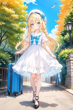 petite,loli,1girl, dress, blonde_hair, long_hair, solo, blue_eyes, braid, checkered_floor, hat, white_dress, white_headwear, day, bird, outdoors, white_footwear, suitcase, sky, sailor_dress, holding, breasts, walking, cloud, full_body, high_heels, standing, sailor_collar, frills