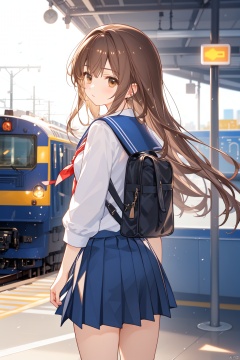 best quality, amazing quality, very aesthetic,1girl, solo, skirt, school_uniform, brown_hair, looking_at_viewer, wind_lift, wind, pleated_skirt, brown_eyes, bag, serafuku, long_sleeves, long_hair, blue_skirt, looking_back, bangs, sailor_collar, train_station, blurry_background, shirt, blurry, school_bag, white_shirt, from_behind, blue_sailor_collar, string, floating_hair, outdoors, earphones, covering_mouth, string_of_fate, standing, clothes_lift, shiny_hair, hand_up