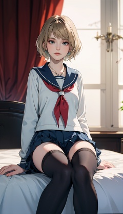 1girl,short hair,thighhighs,indoors,solo,no shoes,sitting,window,school uniform,looking at viewer,long sleeves,white thighhighs,closed mouth,bed,blurry,on bed,serafuku,curtains,sailor collar,skirt,bedroom,sunlight,shirt,neckerchief,jewelry,blurry background,shorts,ashley,<lora:ashleyre4r-000005:0.8>,