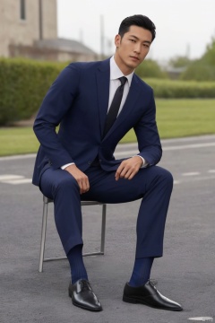jzns,1man,male focus,asian,exquisite facial features,handsome,formal suit,necktie,pants,(navy sheer socks),footwear,sitting,crossed legs,Volumetric lighting,blurry,full shot,outdoors,masterpiece, realistic, best quality, highly detailed, Ultra High Resolution,profession, jznssw,br