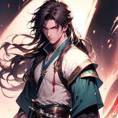 A highly skilled male assassin with long hair tied up, holding a soft sword, and painting in ink and wash