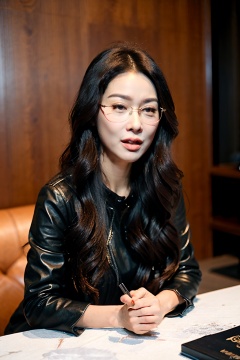 (Masterpiece, best picture quality, realistic), girl,makeup,lipstick,glasses,rolling eyes,tongue out to the side,black hair, red Gothic, leather sofa, Queen Sitting, tabletop display, clock background, crazy details, contour light, flash effects, Sharpening, mole on left cheek, xuekaiqi