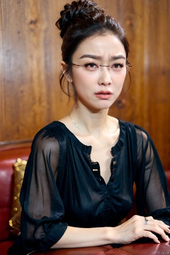 (Masterpiece, best picture quality, realistic), girl,makeup,lipstick,glasses,crying,upset,tears,updo, red Gothic, leather sofa, Queen Sitting, tabletop display, clock background, crazy details, contour light, flash effects, Sharpening, mole on left cheek, xuekaiqi