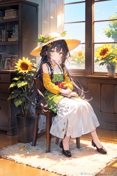 1girl, bird, flower, long hair, grapes, black hair, sitting, solo, green eyes, pillar, fruit, book, hair ornament, food, hat, plant, dress, jewelry, long sleeves, green dress, vase, braid, railing, column, very long hair, book stack, watermark, beads, full body, sunflower, yellow dress, tassel, leaf