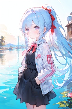 (best quality), ((masterpiece)), (highres),standing,original, extremely detailed wallpaper, (an extremely delicate and beautiful),pink eyes,,(loli),(petite),blue hair,(white Jacket),high ponytail,white collared shirt,hair flower,fipped hair,floating hair,Frown,hands in pockets,black dress,red bowtie,(solo),