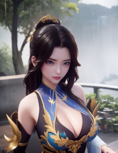 <lora:514-DA-万古狂帝-柳妃:0.8>(,1girl, ,best quality, ),looking at viewer,masterpiece, (( , )),,ultra realistic 8k cg, ,      ,building, bare_shoulders,cleavage cutout, eyelashes,magic,hydrokinesis,sweat, wet, rain, ,       (cleavage), (),