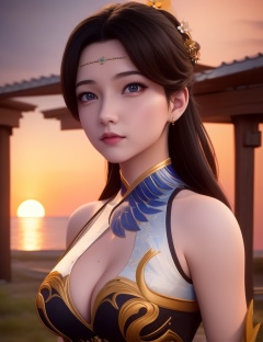 <lora:514-DA-万古狂帝-柳妃:0.8>(,1girl, ,best quality, ),looking at viewer,masterpiece, (( , )),, realistic,science fiction,mole, ultra realistic 8k cg, , sun,sunset, (cleavage), (),