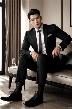 jzns,1man,male focus,asian,exquisite facial features,handsome,formal suit,necktie,pants,(black sheer socks:1.2),footwear,sitting,crossed legs,Volumetric lighting,blurry,full shot,masterpiece, realistic, best quality, highly detailed, Ultra High Resolution,profession, jznssw,br,