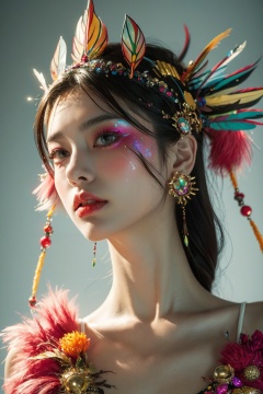 masterpiece,best quality,ultra high res,1girl,colorful tashan makeup,upper body,<lora:20240401caizhuang-v1.2:0.7>,Stink Bug headdress,BBrutal,Glass texture,Top View,