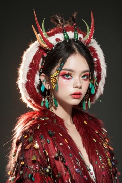masterpiece,best quality,ultra high res,1girl,colorful tashan makeup,upper body,flash,<lora:20240401caizhuang-v1.2:0.8>,Tobacco Hornworm headdress,mood lighting,Fur texture,Long Shot,