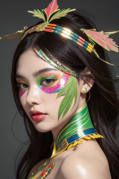 masterpiece,best quality,ultra high res,1girl,colorful tashan makeup,upper body,<lora:20240401caizhuang-v1.2:0.7>,Leafhopper headdress,Yrayvray,Plastic texture,Close-up view,