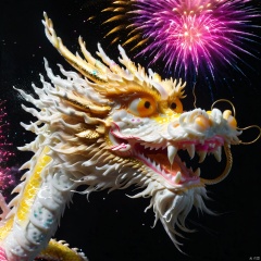 Texture frosted,a lovely Chinese dragon dance, dragon head close-up,colorful light and shadow, brilliant fireworks, wave dots, fluorescent pink gold, amazing masterpiece,ultra-high definition, rich color, feline,painting,Mr.,Brainwash,artistic conception ink and wash,dissolved and disappeared into particles,semitransparent fluorescence,luminescent particles, glow, loong, ral-friedegg