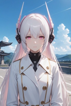 masterpiece,bestquality,1girl,long hair,solo,white hair,pink eyes,outdoors,blue sky,white coat,headgear,LIV,expressionless,empty_eyes