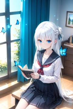 (masterpiece),(best quality),illustration,ultra detailed,hdr,Depth of field,(colorful),1girl,bug,butterfly,solo,blue butterfly,blue eyes,school uniform,skirt,long hair,window,book,sitting,sailor collar,indoors,black skirt,serafuku,neckerchief,long sleeves,red neckerchief,white shirt,shirt,white hair,looking at viewer,black sailor collar,curtains,braid,closed mouth,holding,pleated skirt,hair bun,collarbone,very long hair,wooden floor,desk,holding book,