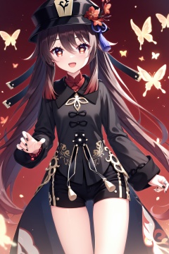 (masterpiece),(best quality),illustration,ultra detailed,hdr,Depth of field,(colorful),1girl,hu tao (genshin impact),solo,brown hair,hat,looking at viewer,shorts,long hair,symbol-shaped pupils,butterfly,bug,twintails,long sleeves,red eyes,open mouth,smile,black nails,black headwear,black shorts,flower,nail polish,thighs,short shorts,red background,hat flower,flower-shaped pupils,hair between eyes,very long hair,coattails,thigh gap,