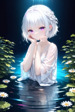 (masterpiece),(best quality),illustration,ultra detailed,hdr,Depth of field,(colorful),(chromatic aberration),(beautiful young female:1.4),(streaming tears),sad,(daisy),(daisy),(daisy),looking at viewer,partially submerged,both hands on own cheek,{see-through long shirt},{no bra},(white hair, short hair, bangs:1.2),(glowing eyes),ripples,dark water,black background,(prismatic),