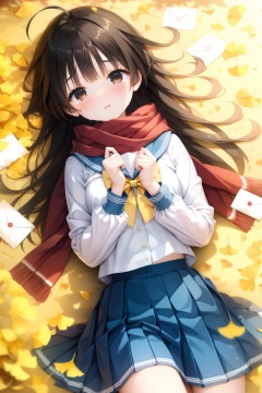(masterpiece),(best quality),illustration,ultra detailed,hdr,Depth of field,(colorful),1girl,solo,school uniform,skirt,scarf,lying,serafuku,on back,long sleeves,autumn,blue skirt,looking at viewer,sailor collar,bow,brown eyes,long hair,tears,autumn leaves,bangs,blue sailor collar,shirt,parted lips,pleated skirt,white shirt,envelope,ahoge,blurry,red scarf,black hair,crying,leaf,letter,crying with eyes open,yellow bow,outdoors,brown hair,bowtie,ginkgo leaf,from above,tearing up,blush,