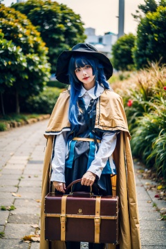 best quality,masterpiece,1girl,roxy migurdia,solo,long hair,looking at viewer,hat,holding,bangs,blue hair,skirt,blue eyes,outdoors,cape,plant,autumn,suitcase,black skirt,photo background,brown cape,<lora:RoxyMigurdia_v1_wd14-000010:0.7>