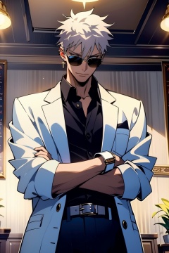 FF,(masterpiece:1.2),best quality,highres,extremely detailed CG,perfect lighting,8k wallpaper,anime,comic,game CG,1boy, male focus, shirt, blue eyes, white hair, sunglasses, watch, short hair, belt, wristwatch, white shirt, hair between eyes, looking at viewer, solo, closed mouth, bangs, white pants, pants, collared shirt, ear piercing, piercing, cowboy shot, jewelry, gloves, crossed arms, earrings, white gloves, long sleeves, striped, black belt, upper body, gojou satoru, white jacket, jacket, standing, indoors