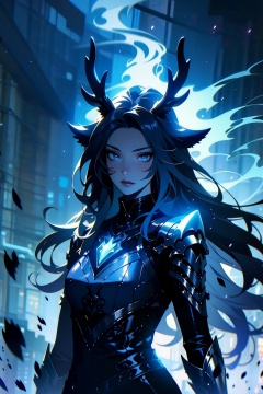 FF,(masterpiece:1.2),best quality,highres,extremely detailed CG,perfect lighting,8k wallpaper,anime,comic,game CG,1girl,solo,long hair,glowing,horns,blue theme,glowing eyes,blue eyes,looking at viewer,animal ears,antlers,dress,armor,black dress,blue fire,parted lips,