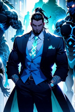 FF,(masterpiece:1.2),best quality,highres,extremely detailed CG,perfect lighting,8k wallpaper,anime,comic,game CG,solo, male focus, watch, necktie, hand in pocket, tattoo, gloves, black hair, pants, shirt, facial hair, wristwatch, jacket, beard, 1boy, looking at viewer, vest, fingerless gloves, black gloves, collared shirt, ponytail, formal, standing, black pants, horns, glowing, multiple boys, arm tattoo, black shirt, suit, cowboy shot, open clothes, blue theme, blue necktie, coat