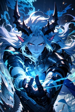 FF,(masterpiece:1.2),best quality,highres,extremely detailed CG,perfect lighting,8k wallpaper,anime,comic,game CG,solo,horns,long hair,white hair,colored skin,red eyes,glowing,blue skin,pointy ears,floating hair,1boy,armor,male focus,fire,signature,glowing eyes,artist name,gloves,blue theme,black gloves,1girl,closed mouth,torn clothes,