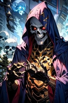 FF,(masterpiece:1.2),best quality,highres,extremely detailed CG,perfect lighting,8k wallpaper,anime,comic,game CG,hood, red eyes, hood up, 1boy, robe, male focus, hooded robe, solo, glowing, wide sleeves, fingernails, holding, magic, skull, long sleeves, ring, skeleton, upper body, black robe, sharp fingernails