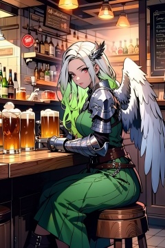 FF,(masterpiece:1.2),best quality,highres,extremely detailed CG,perfect lighting,8k wallpaper,anime,comic,game CG,1girl,solo,wings,stool,bar (place),armor,cup,green hair,sitting,indoors,long hair,gloves,bottle,gauntlets,mug,feathered wings,alcohol,white hair,hair ornament,gradient hair,boots,bar stool,looking at viewer,multicolored hair,breasts,red eyes,brown gloves,green skirt,belt,closed mouth,counter,holding cup,skirt,beer mug,