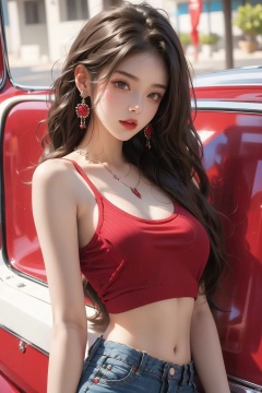 1 girl, red camisole,navel,Upper bodyr,earrings