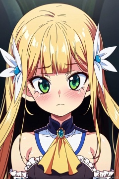 1girl, solo, blonde hair, green eyes, blush, hair ornament, long hair, bangs, looking at viewer, ascot, upper body, sidelocks, blunt bangs