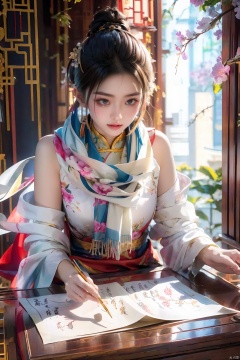 1girl,Chinese dress, table, scarf, wind, tea cup, Ancient architecture, calligraphy, pen,flower branch